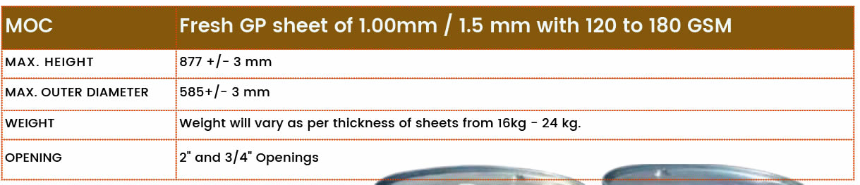 Our company specializes in producing a unique line of galvanized barrels from GP sheet with a zinc coating of 90 GSM to 200 GSM for our customers, satisfying their wide range of packaging needs. Barrels are made in accordance with IS Standards.
